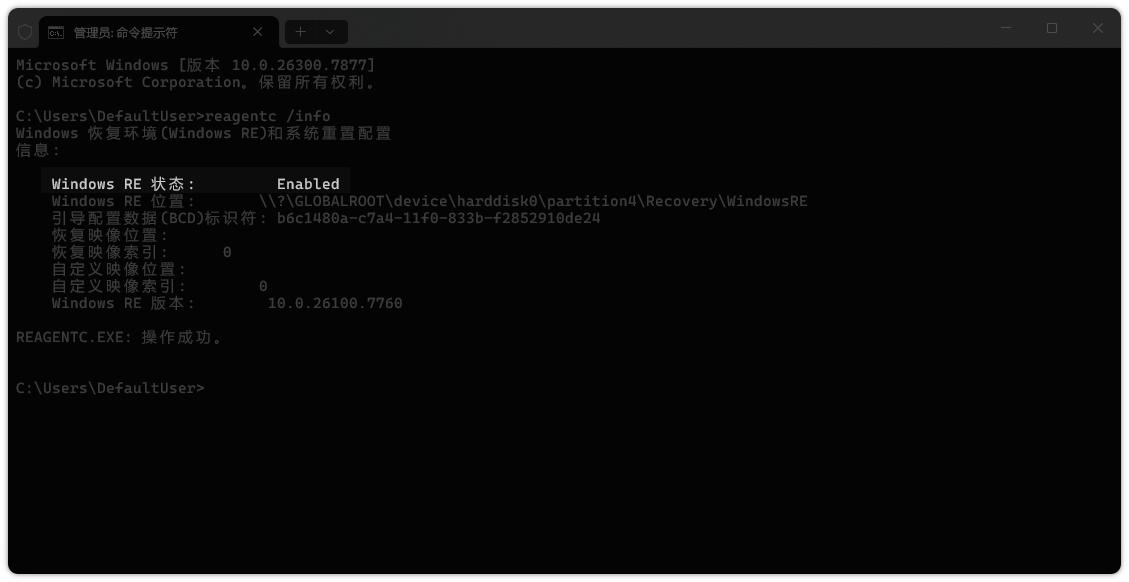 reagentc /enabled 完成后,Windows 恢复环境 理应被启用。